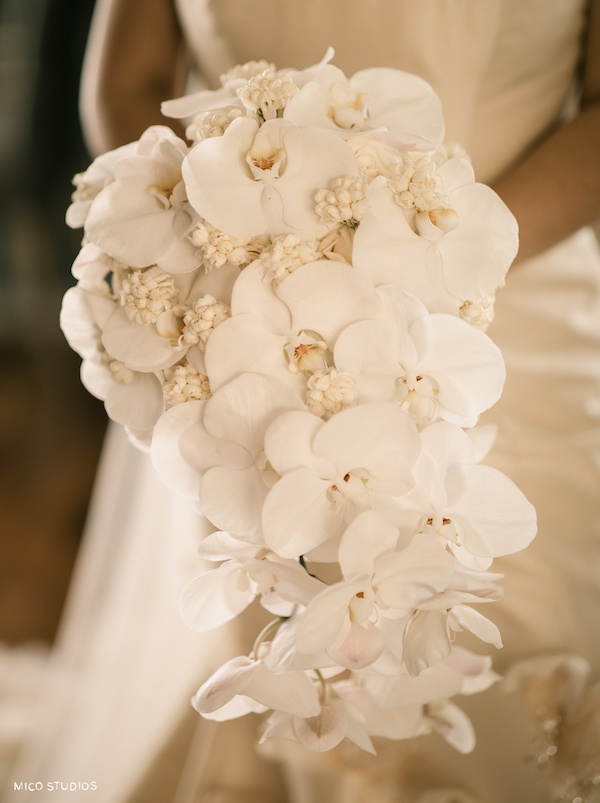 Dramatic and flowing, cascading orchids create a spectacular statement piece for any bride looking to impress. This style combines the exotic beauty of orchids with a waterfall-like arrangement that elegantly drapes from the hands.